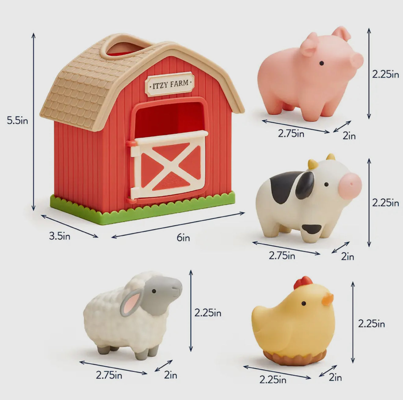 Little Farm, Big Fun! Learning is a blast with the charming Itzy Play Barn"™ spill and fill activity toy! Featuring a mini barn with hinged door and rooftop opening plus four soft, squeezy animals, your babe's imagination will go through the roof as they explore put-and-take play, learn object permanence, and create endless storytelling adventures.
