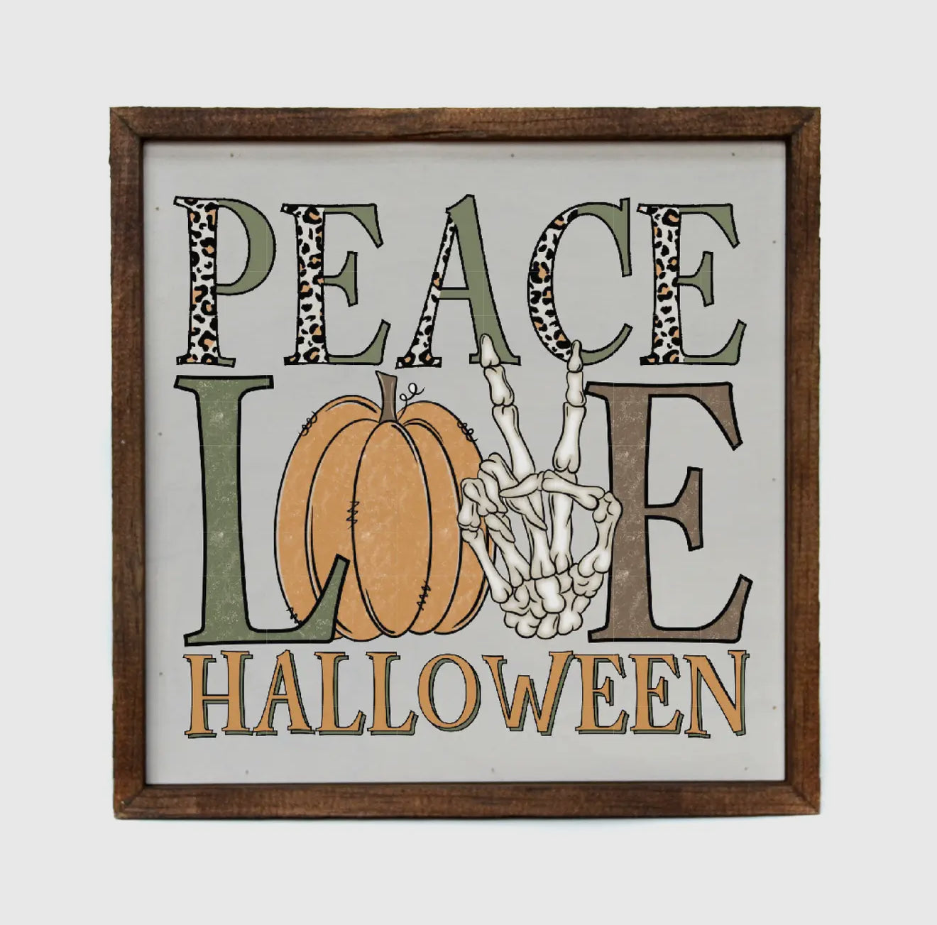 Add some spooky fun to your décor with this “Peace Love Halloween” 10” x 10” wooden sign. Featuring a rustic wood frame, leopard print accents, a festive orange pumpkin, and a skeleton hand peace sign, it’s the perfect mix of playful and eerie for the Halloween season. Great for mantels, shelves, or entryway displays.